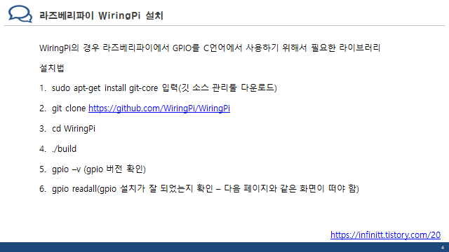 위의 코드는 C코드로 작성되었으며, C코드를 사용하려면 WiringPI을 설치해야합니다.