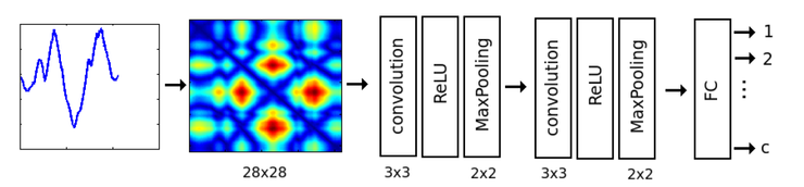 Classification of Time-Series Images Using Deep Convolutional Neural Networks 연구에서는 RP를 이용하여 시계열 데이터를 이미지로 표현한 후 아래와 같은 구조의 CNN을 적용하여 UCR 시계열 데이터를 분류 하였습니다.