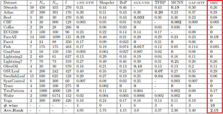 동일한 데이터 세트에 대해 기존 혹은 최신 시계열 데이터 알고리즘과 비교하였을 때, 대부분의 데이터 세트에서 오차율(잘못 분류된 데이터의 비율)이 많이 개선된 것을 확인할 수 있습니다.