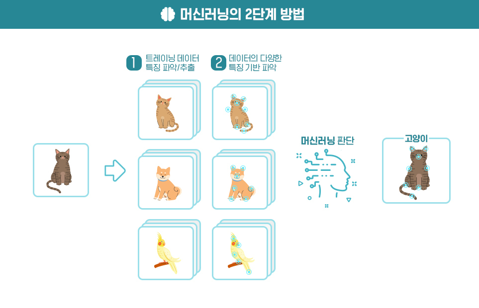 예를 들어, 고양이를 판단하는 경우에 1단계에서 얼굴 모양, 다리/눈의 개수, 눈/코/입의 구조, 귀의 모양 등의 특징을 추출하고 나서, 2단계에서 얼굴의 둥근 모양, 다리가 4개, 눈이 2개, 눈/코/입/귀 삼각형 모양 등의 특징을 기준으로 “고양이”라고 판단하는 것입니다.